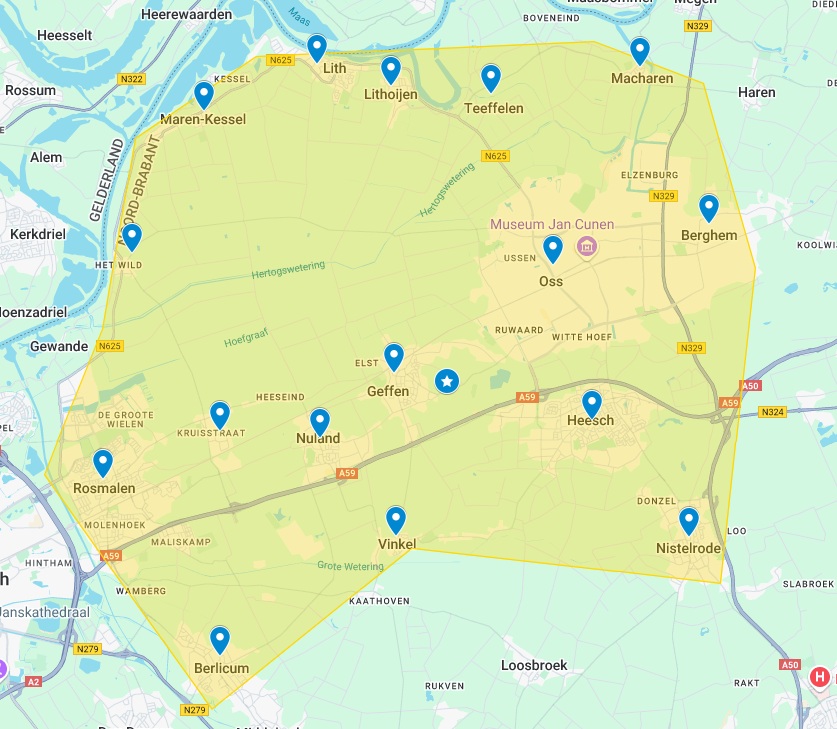 Berghem, Berlicum, Geffen, Haren, Heesch, Het Wild, Kruisstraat, Lith, Lithoijen, Macharen, Maren-Kessel, Megen, Nistelrode, Nuland, Oijen, Oss, Rosmalen, Teeffelen, Vinkel.